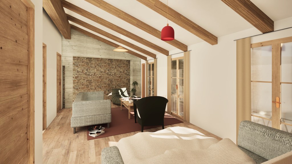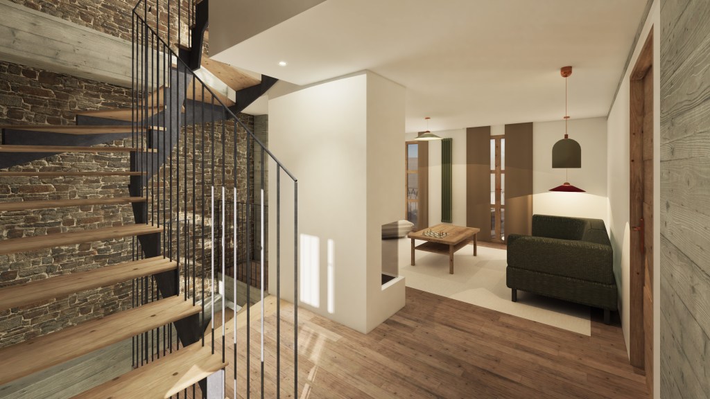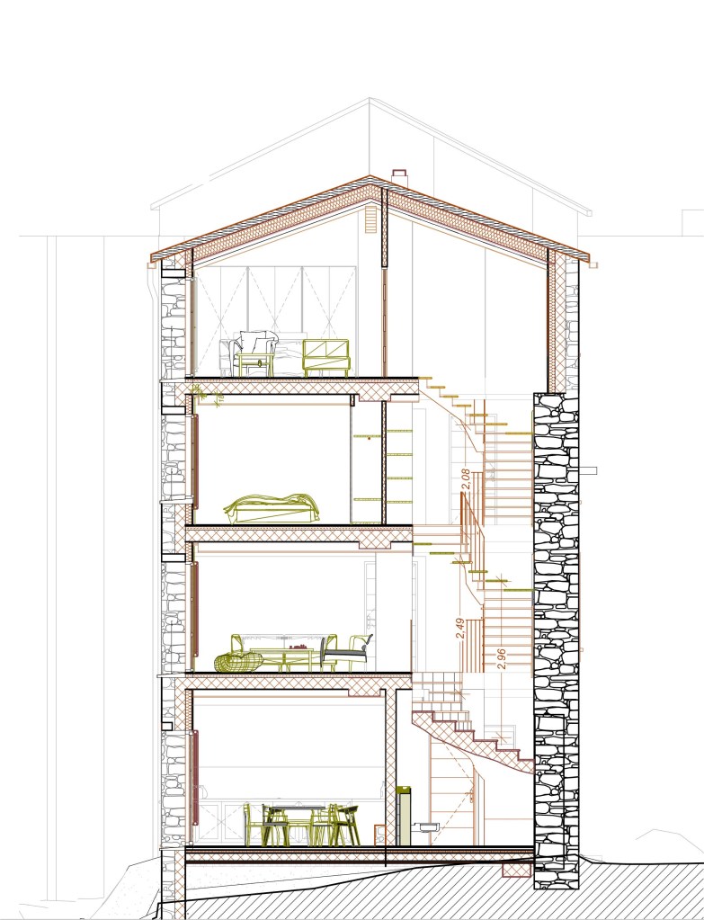 Située en coeur de village, cette ancienne bâtisse s’élève déjà sur 4 niveaux. Afin de la rendre habitable, les niveaux sont ventilés et une structure en béton est insérée entre les murs anciens pour supporter la surélévation. Les murs existants en pierre et la nouvelle structure en béton brut sont visibles à tous les niveaux de l’édifice. Leur association rappelle les strates du passé cette maison donne ainsi accès à son son histoire. Des menuiseries en bois viennent adoucir cet environnement minéral.