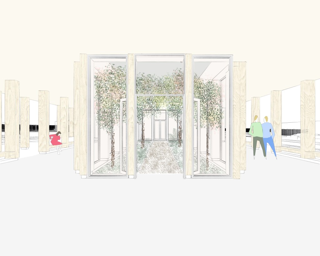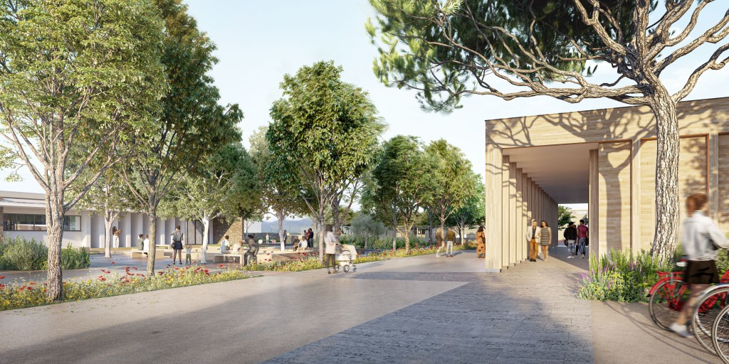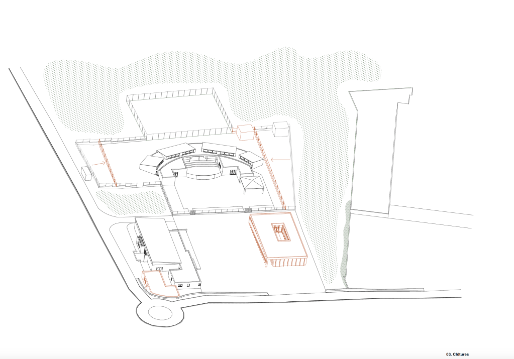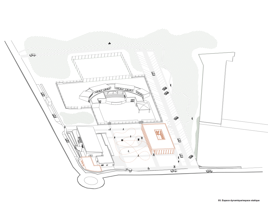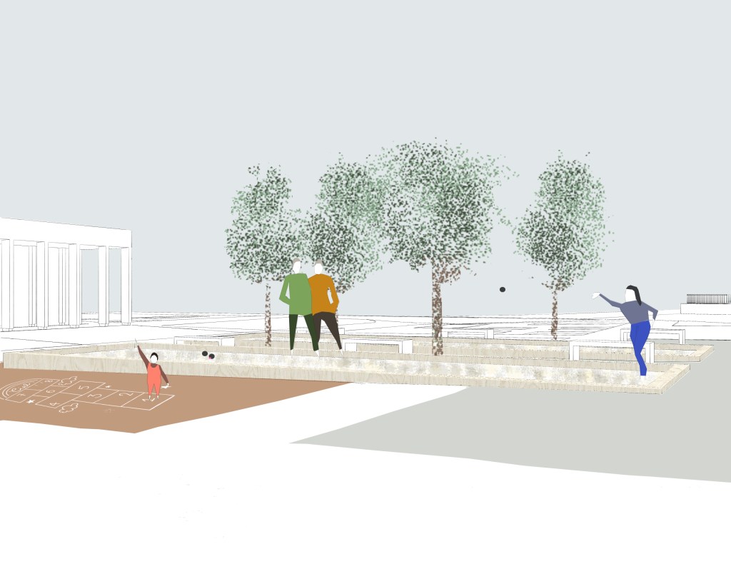 C’est une place qui doit s’inscrire, une place dont l’aménagement doit être structuré. Celui-ci est conditionné par l’équilibre entre le plein et vide. Aujourd’hui, deux équipements ont été édifiés au Nord et à l’Ouest. Leur traitement architectural sont nettement différenciés. Cela invite à la sobriété. Une place est liée à la notion de temporalité : les temps de parcours, de partage, de pause et de découverte.