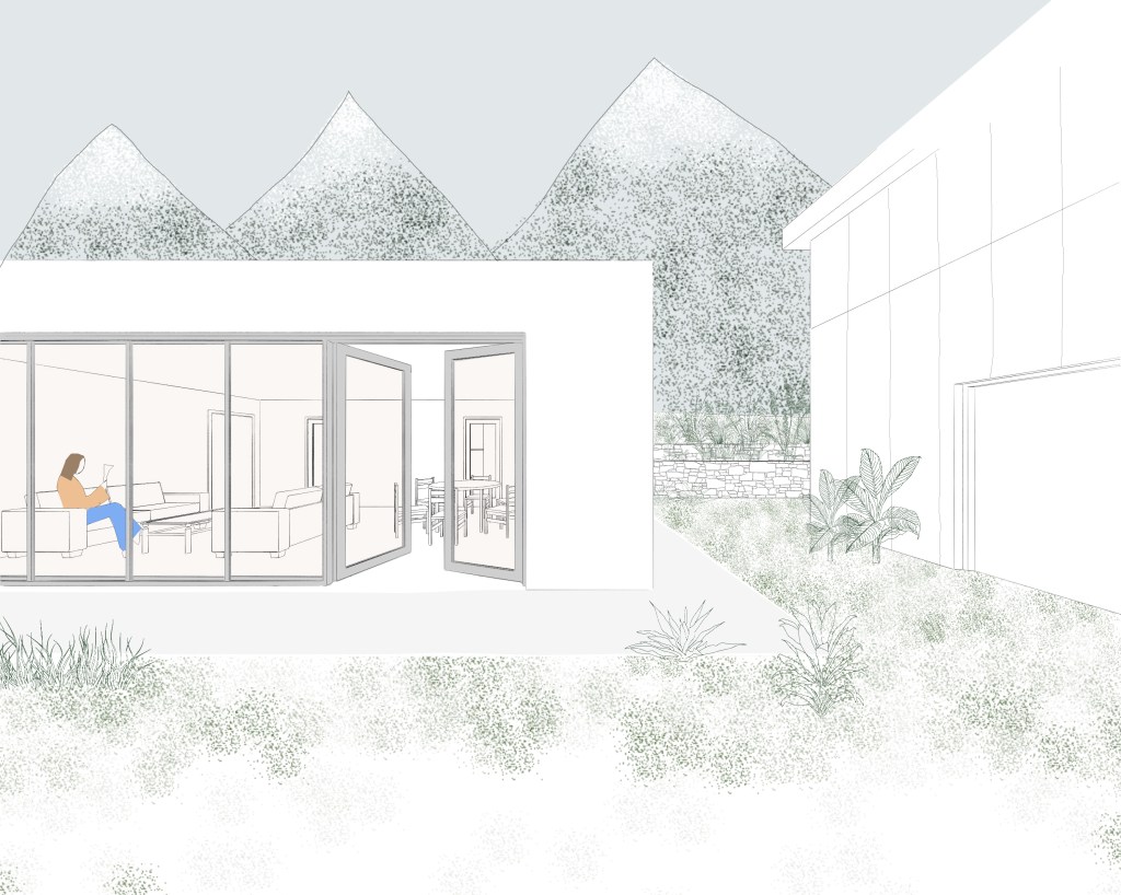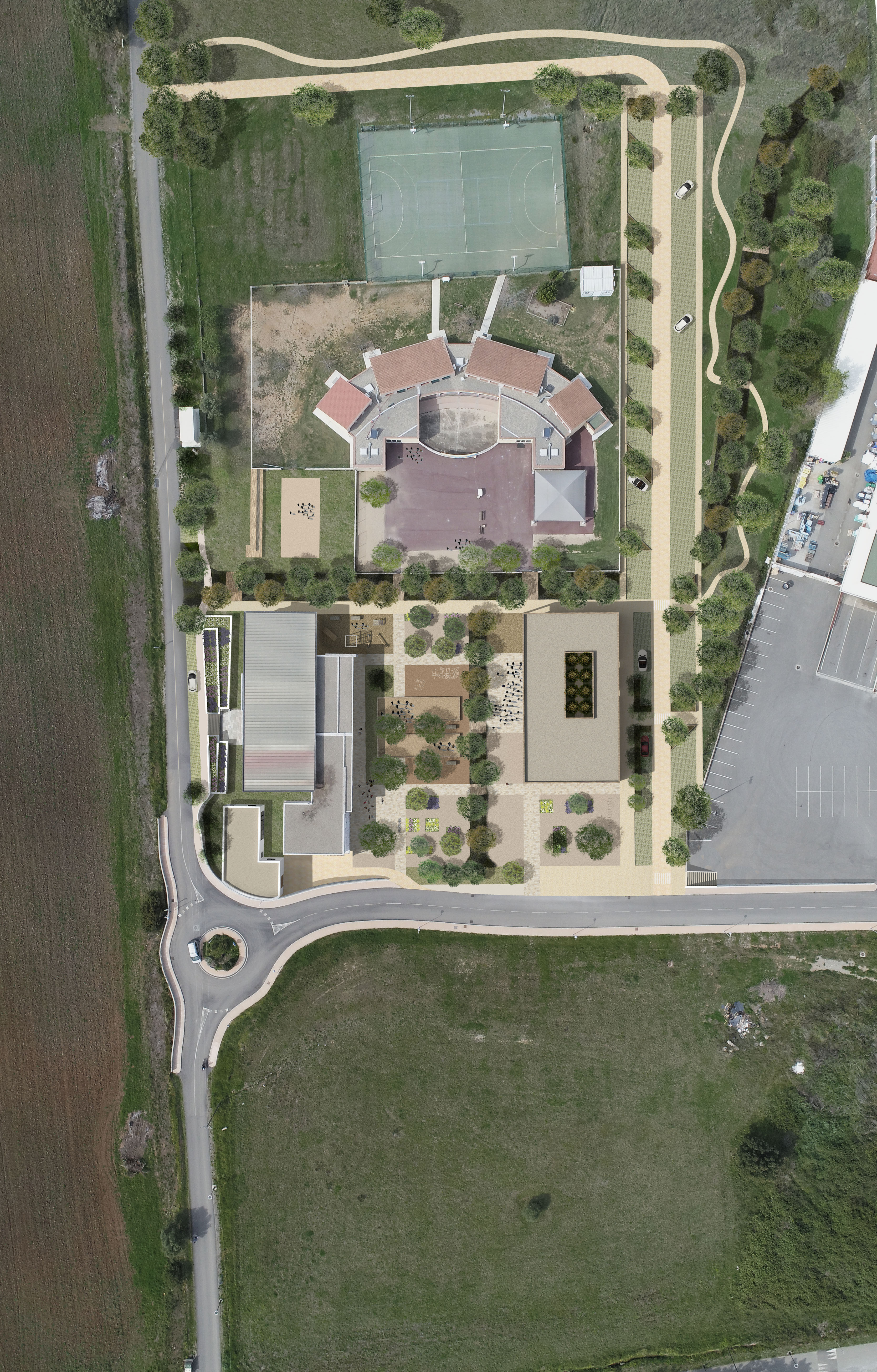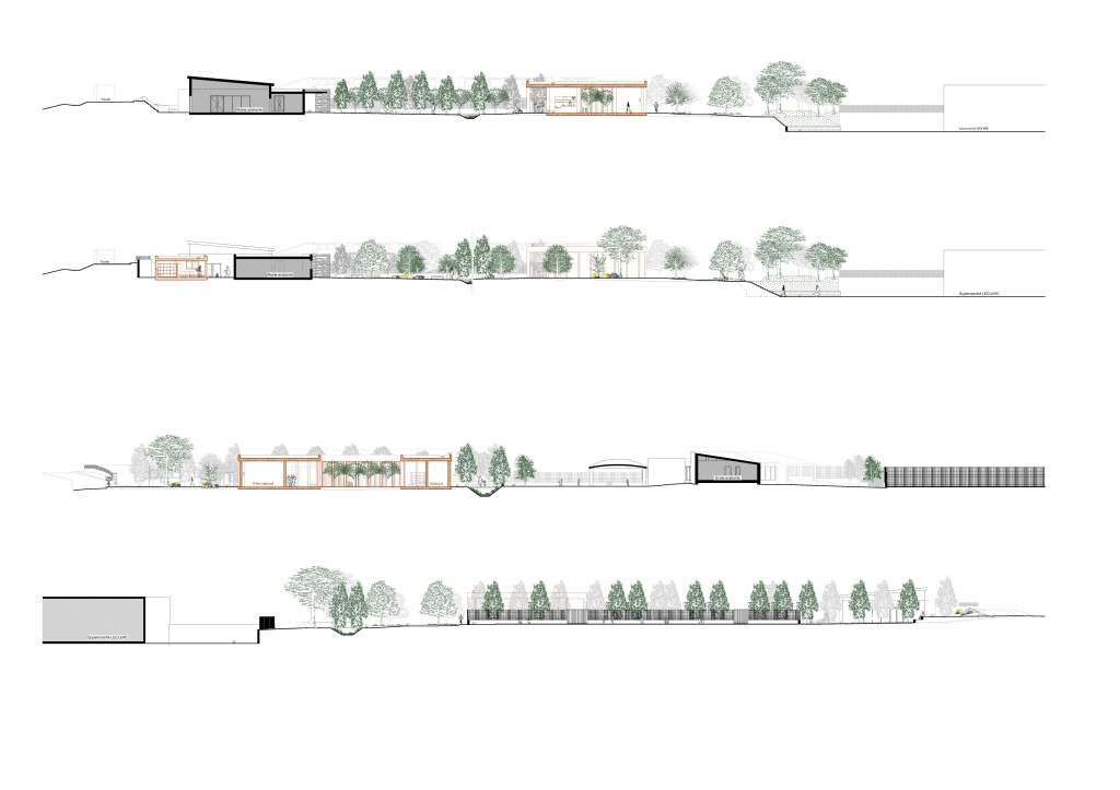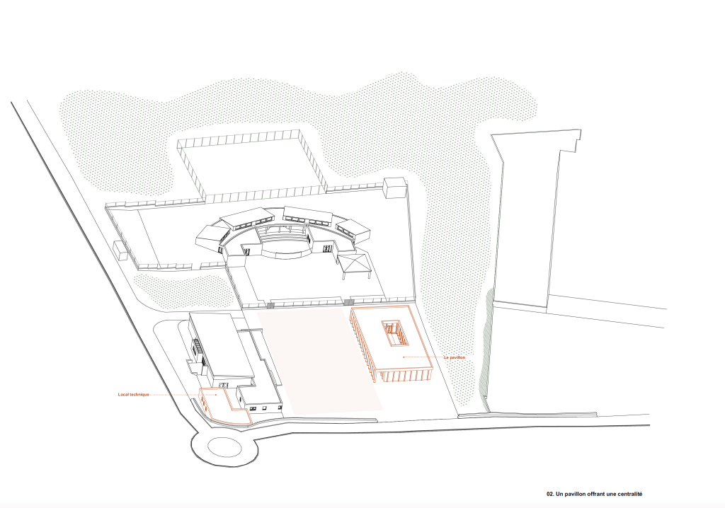 Nous avons projeté «trois temps». Un premier temps, lieu de convergence entre la mairie et le futur pavillon, élément dominant de l’espace public. Un second temps, le temps de parcours et de promenade autour d’un milieu végétalisé, entre l’école et le supermarché, qui a de plus fonction de masque à la façade arrière du Leclerc. Un troisième temps, un temps d’entracte, un théâtre de verdure au Nord de la mairie, qui assurera une future connexion avec la maison de l’artisanat. Les aires de stationnement s’installent en limite Est du pavillon et de l’école de part et d’autre d’une nouvelle voie secondaire. Cette dernière permettra plus tard de liaisonner cette centralité aux futurs quartiers alentours. Ce positionnement permet de libérer le temps 01 de toutes nuisances (sonores, dangerosité…)