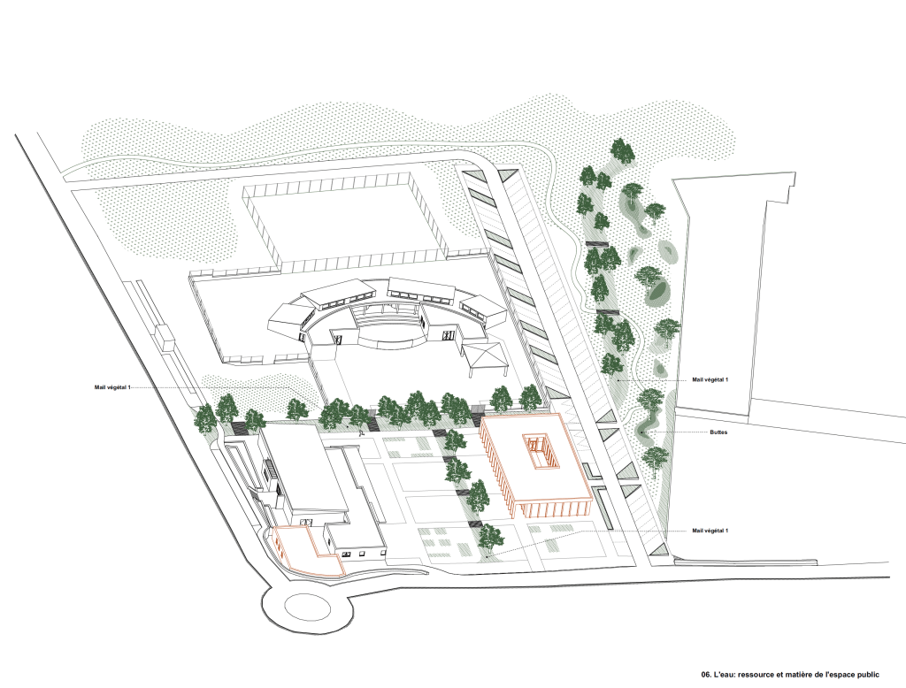 01. Un non lieu – 02. Le pavillon générateur d’une centralité – 03. De nouvelles limites – 04. Les flux , vecteurs de la trame de l’espace public – 05. La place : espace dynamique, les stationnements : espace statique – 06. L’eau : ressource et matière de l’espace public