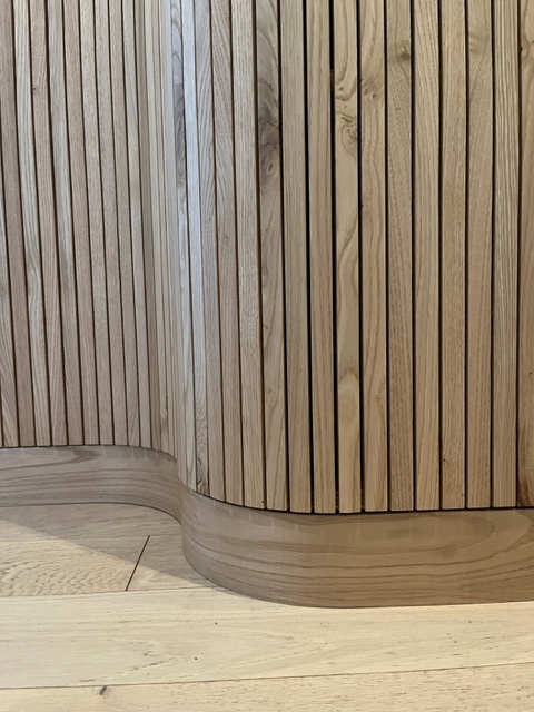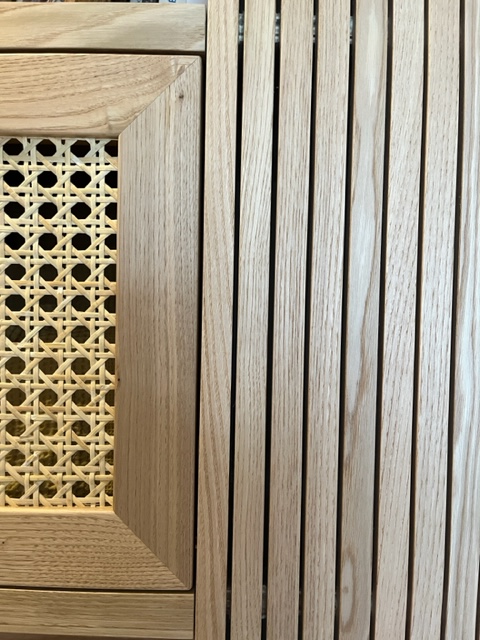Conçue dans un couloir, elle se devait d’avoir une ergonomie en adéquation a l’usage de la pièce qui l’accueillerait : un mouvement rond et rythmé encadre cette bibliothèque multi-usages grâce à ses portes en cannage.