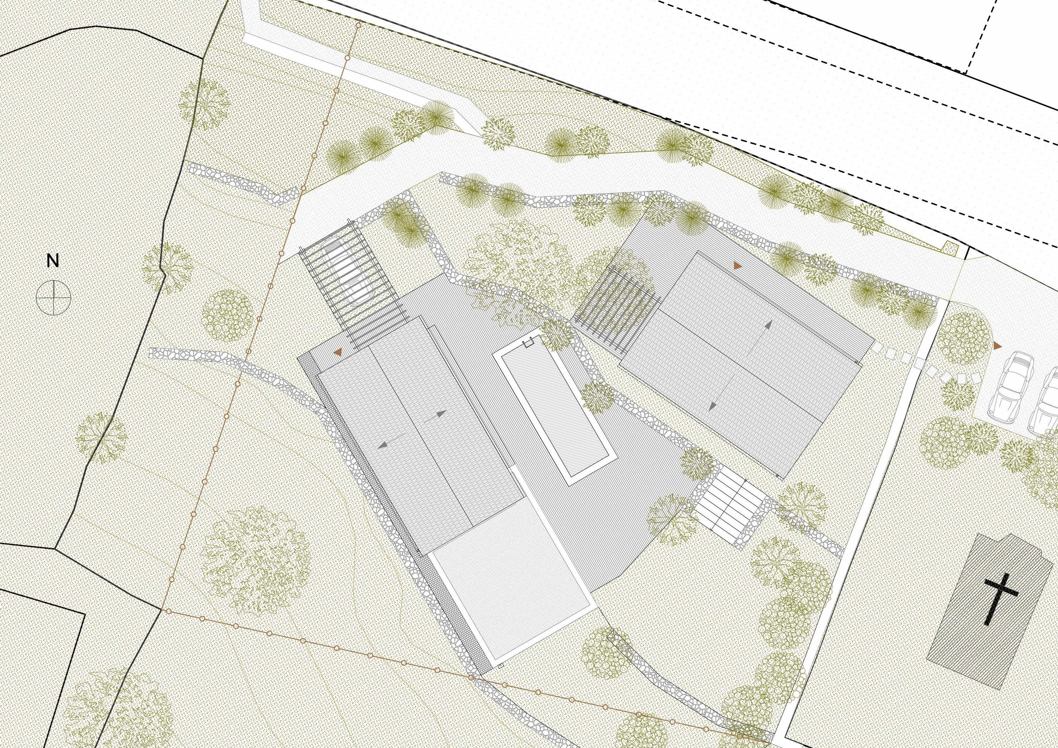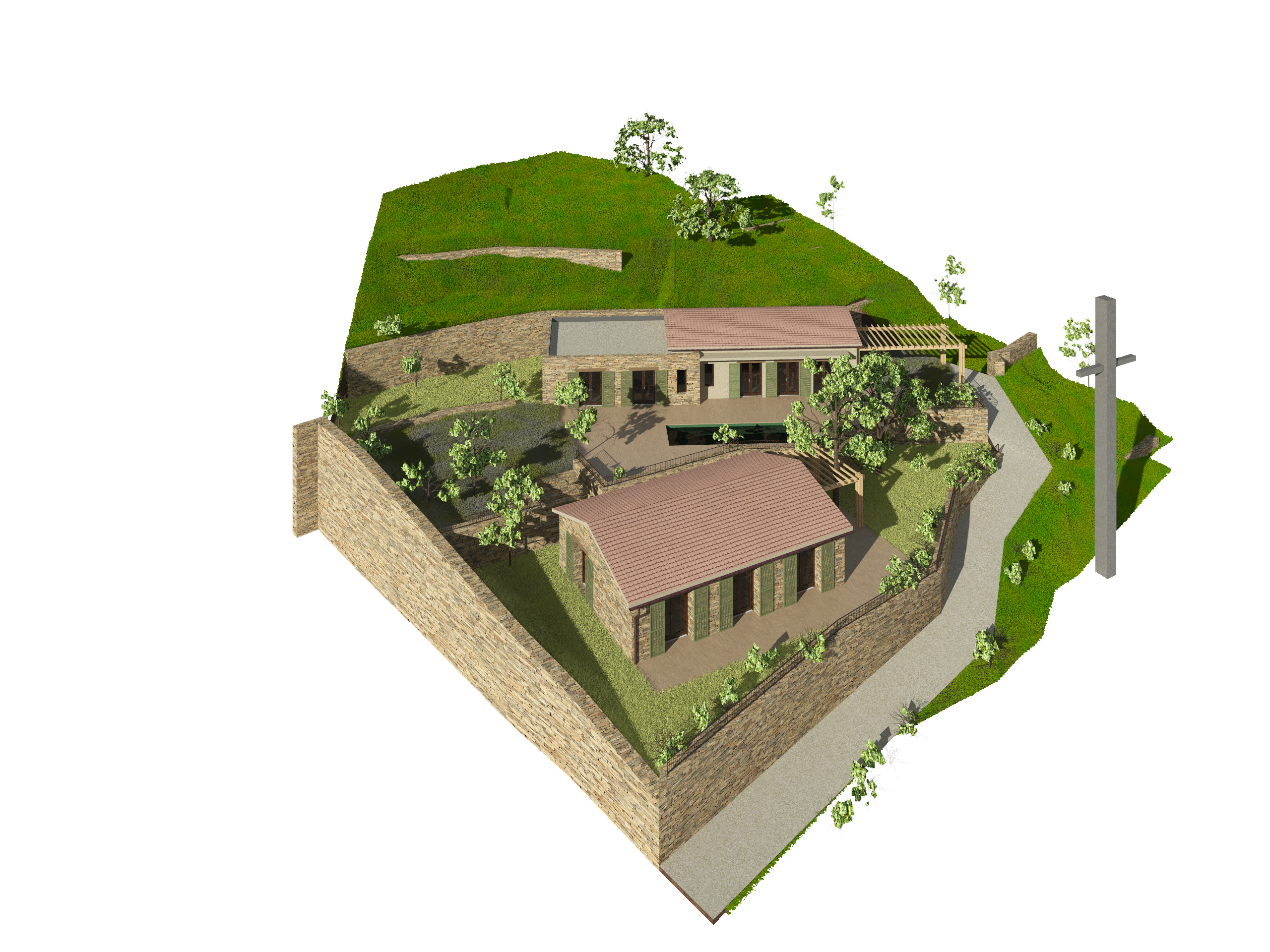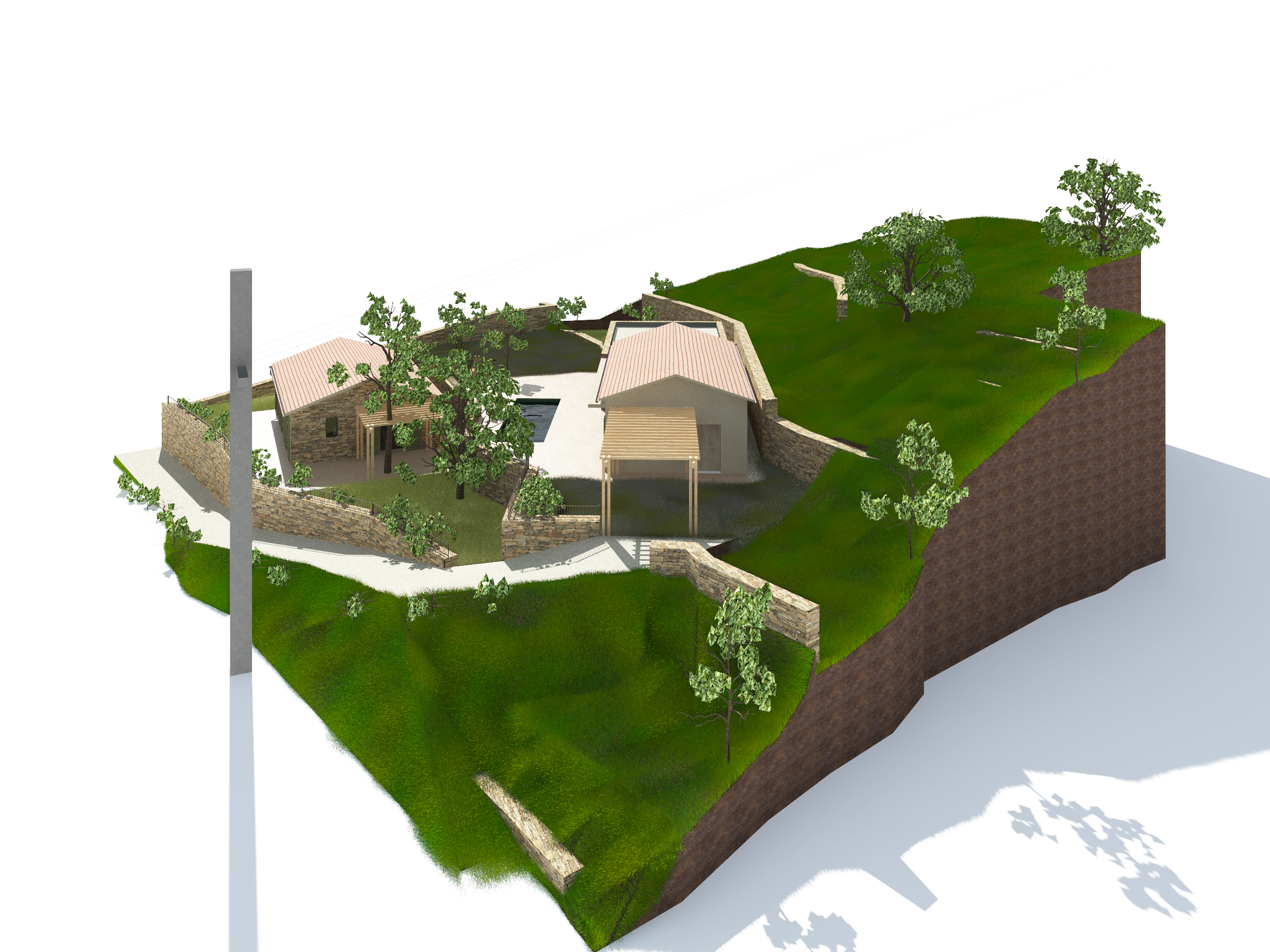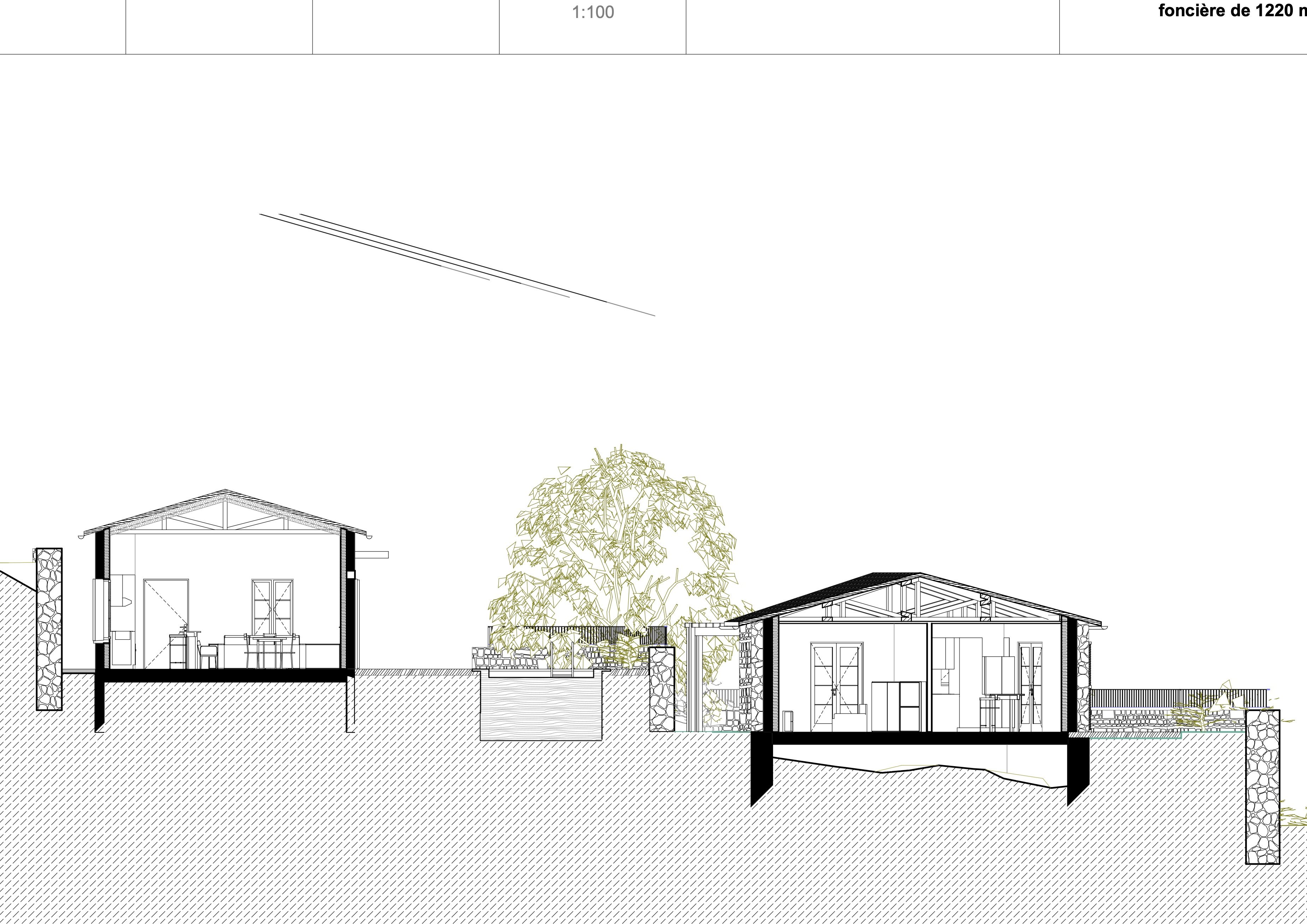 Ici les contraintes deviennent des atouts qui dictent la façon d’aborder le projet sur le terrain complexe: les restanques offrent des zones planes pour implanter deux nouveaux pagliaghju en pierres sèches, totalement intégrés et en harmonie avec les constructions locales.