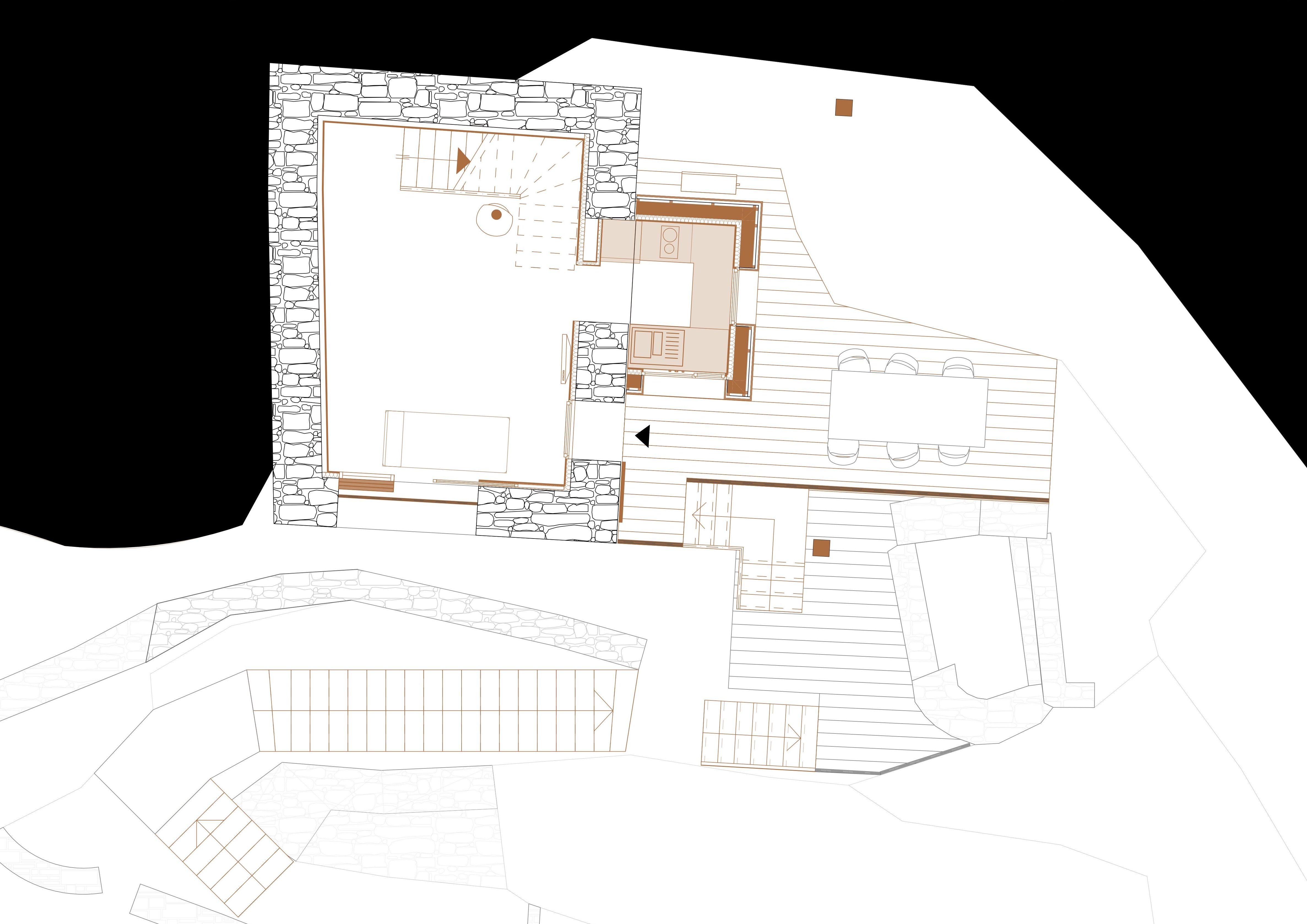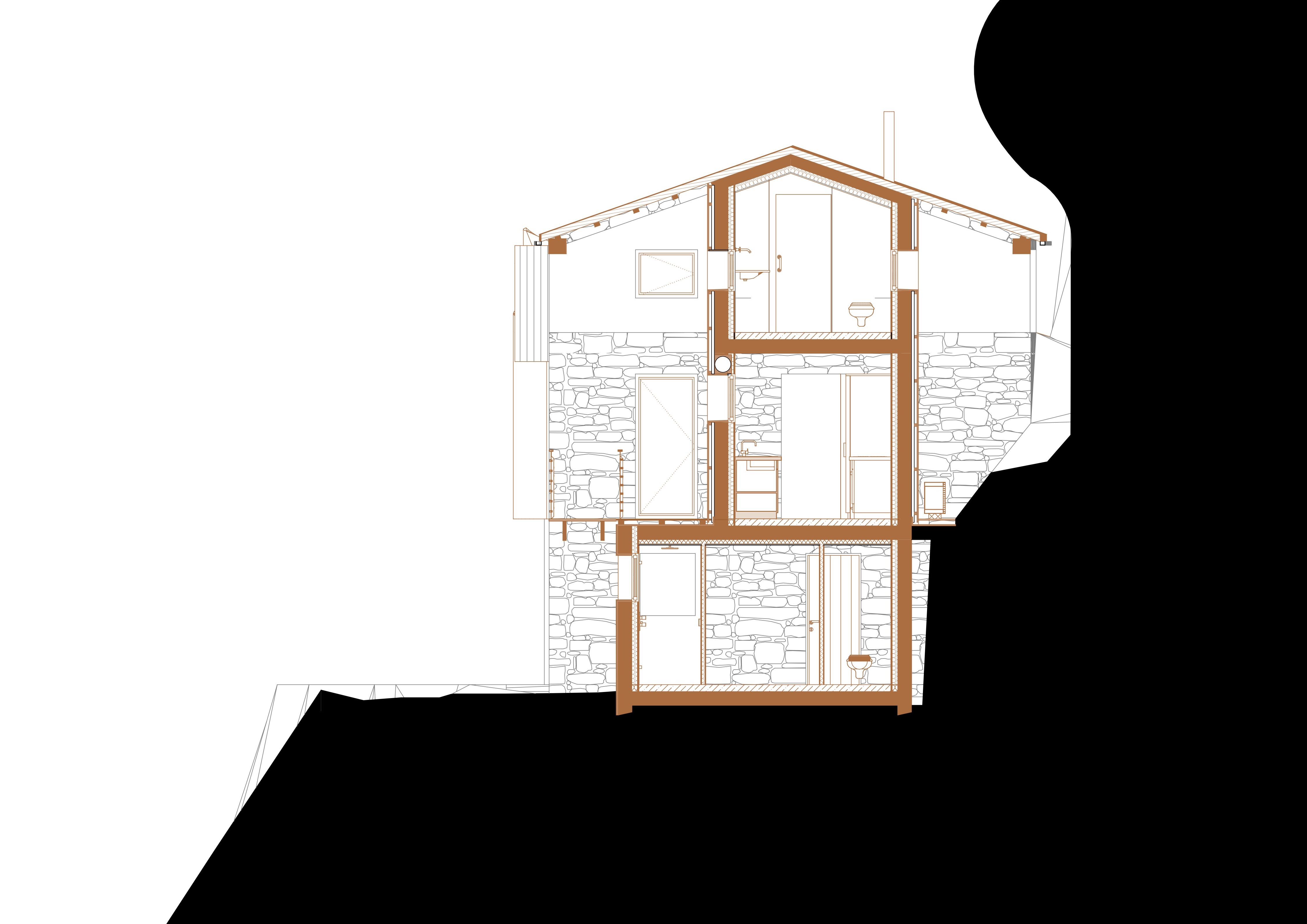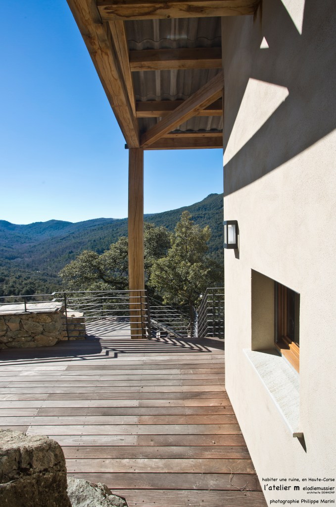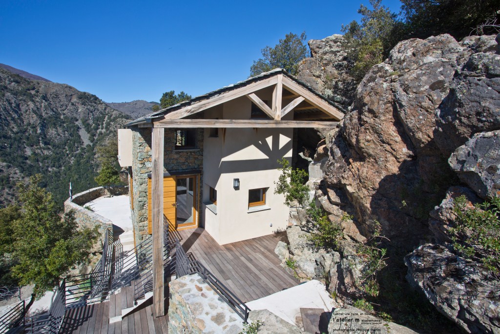 L’écriture architecturale de cette maison est vernaculaire, elle s’inspire et met en scène des matériaux de la région : la pierre, le bois et la lauze.