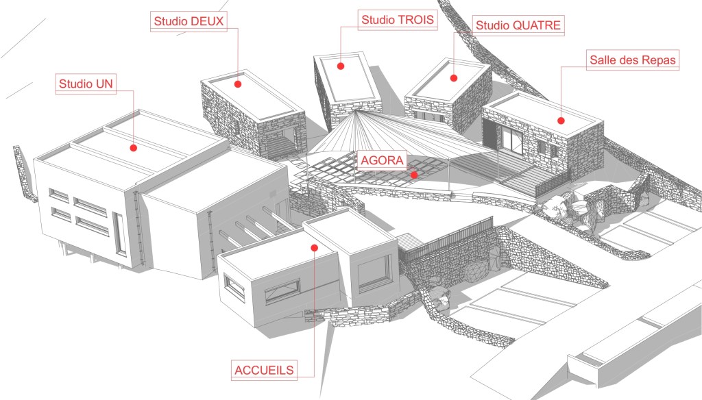 D’un point de vue architectural, ce projet se développe selon une analyse du site où la préservation des vues et du végétal reste le fil conducteur du projet. Ma volonté étant de se poser délicatement sur le sol, de suivre sa pente (très importante par endroits) d’où l’idée d’avoir plusieurs volumes séparés au sol – et parfois, liés entre eux en partie haute par des poutres béton ou des protections solaires – et aussi de générer des «volumes de vide» extérieurs où l’appropriation de ces espaces serait libre et propice à la production artistique mais également à la rencontre et au partage de savoir-faire.