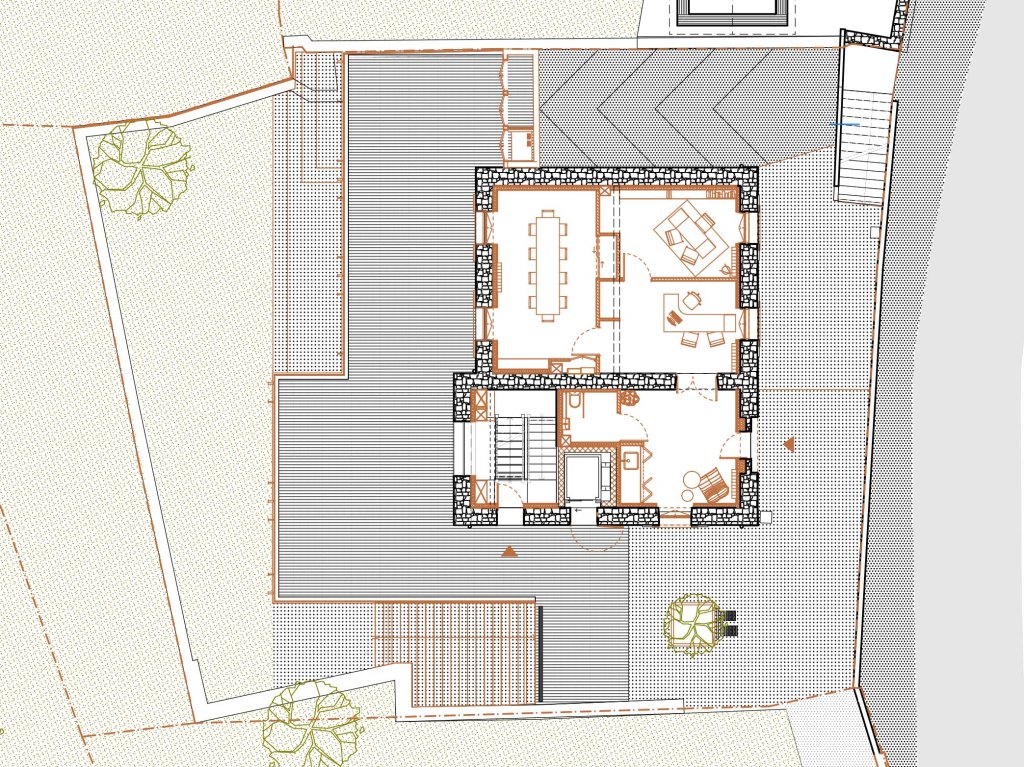 A travers ce projet, le village de Noceta soutient des enjeux forts pour la petite commune : l’entretien de son patrimoine bâti et la mise à disposition de services pour les habitants. En effet l’édifice abritera la mairie, 3 logements mais aussi une salle des fêtes donnant sur le jardin et la vue sur la vallée. Une extension est ajoutée en partie basse du bâtiment, ce qui assoit l’édifice dans la pente tout en conservant son élégance et son identité d’origine. Dans cette extension, on installera la nouvelle salle-des-fêtes. La mairie retrouvera son emplacement d’origine : au rez-de-chaussée et bénéficiera d’un accès au toit-terrasse. Nichés aux 2 derniers étages, les logements bénéficient d’une vue sur la vallée.